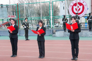 清晨7点,激昂的进行曲奏响,国旗护卫队成员迈着整齐步伐护送五星红旗入场,现场师生的目光聚焦于鲜红的国旗。随着国歌嘹亮响起,国旗缓缓升起,全体师生庄严肃立、行注目礼,法治信仰与爱国情怀在每个人心中凝聚。